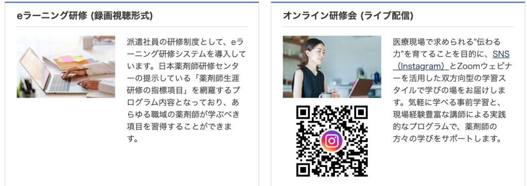 | オンライン研修会 (ライブ配信) | SNS(Instagram)とZoomウェビナーを活用した双方向型の学習スタイルで学べる (例)服薬指導の際のコミュニケーション術など |